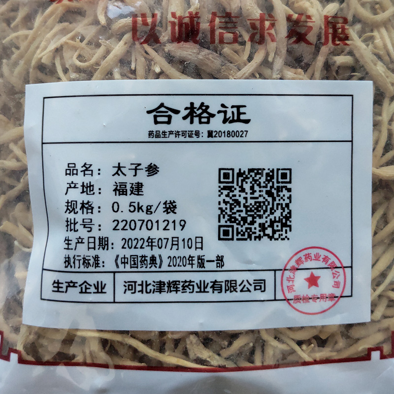 太子参TaizishenPSEUDOSTELLARIAE RADIX 本品为石竹科植物孩儿参Pseudostellaria heterophylla(Miq.)Pax ex Pax et Hoffm.的干燥块根。夏季茎叶大部分枯萎时釆挖,洗净,除去须根,置沸水中略烫后晒干或直接晒干。
