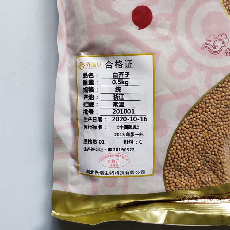 【性状】白芥子 呈球形,直径1.5~2.5mm。表面灰白色至淡黄色,具细微的网纹,有明显的点状种脐。种皮薄而脆,破开后内有白色折叠的子叶,有油性。气微,味辛辣。